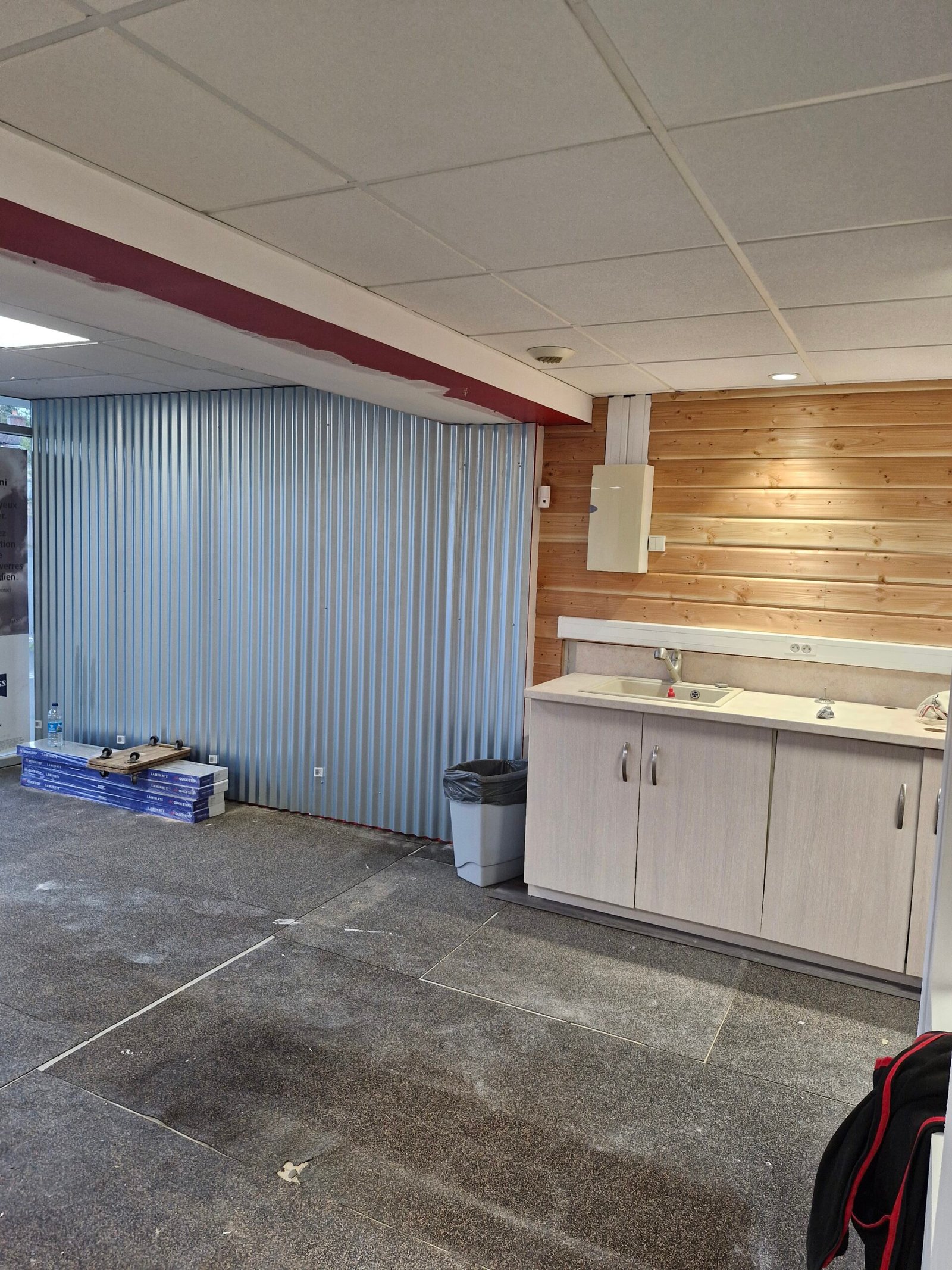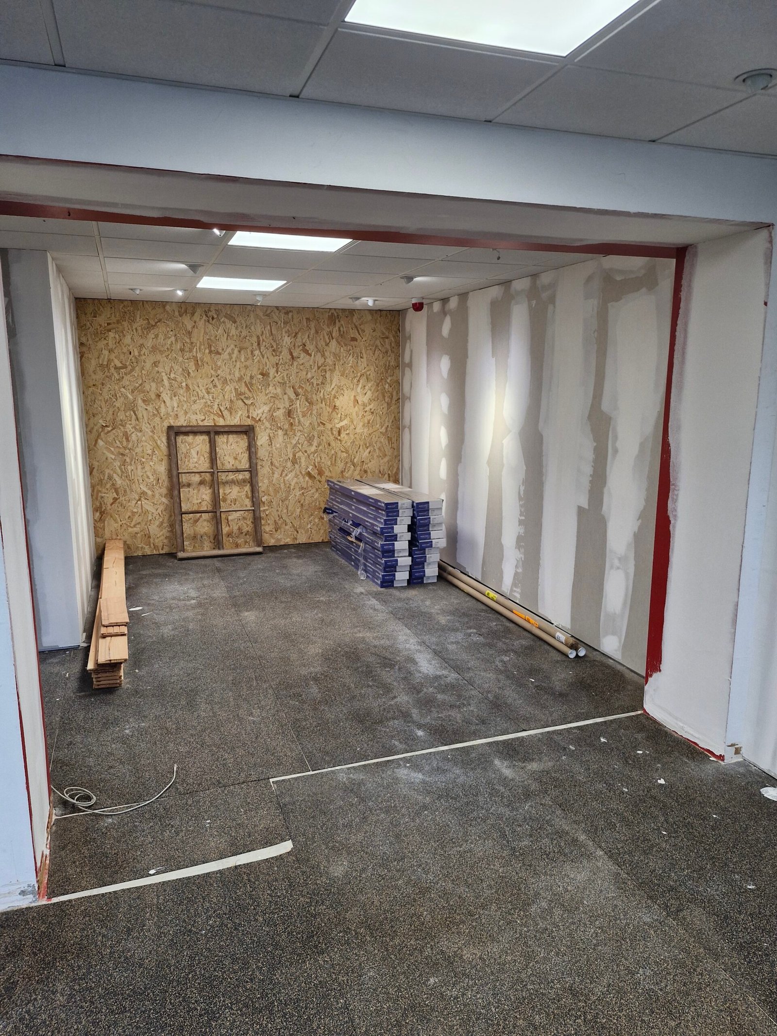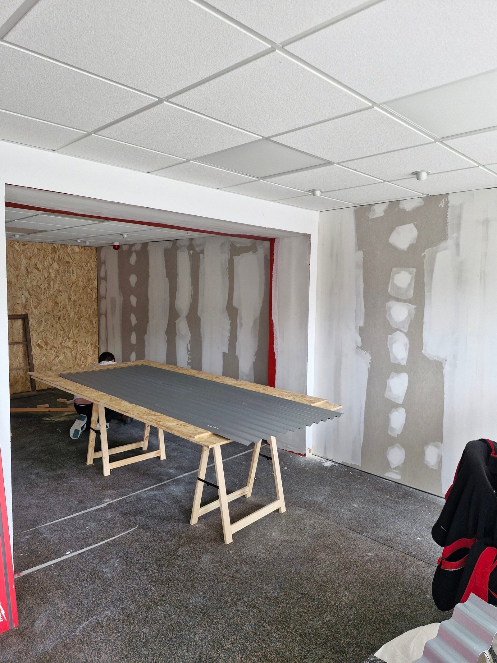 Création de cloison en placo pour délimiter un nouvel espace dans un magasin d’optique. Les travaux ont nécessité la pose de bandes, un habillage des murs avec des plaques d’OSB, et un bardage en bois et tôle. Le rendu final : une cloison à la fois moderne et pratique.