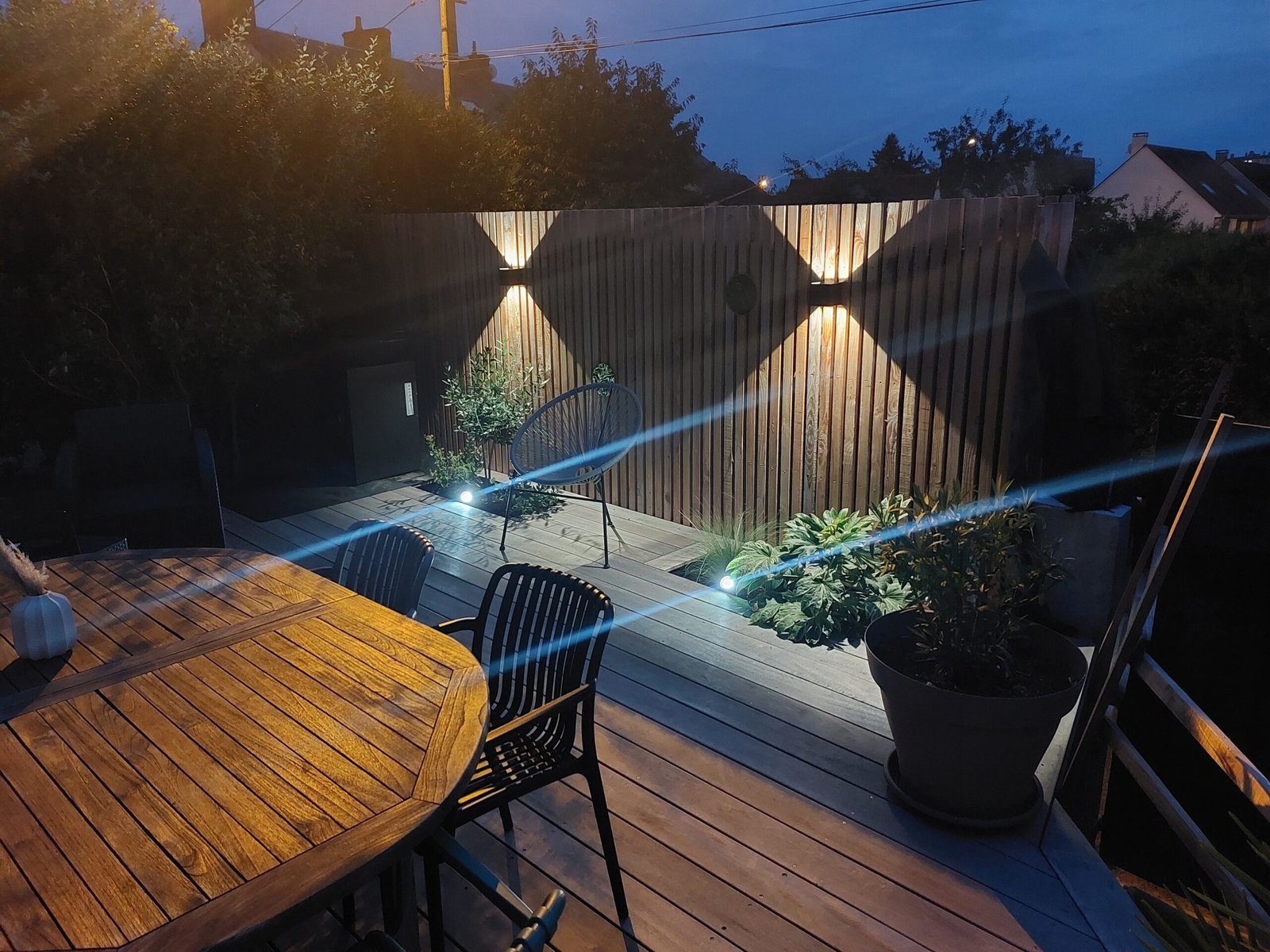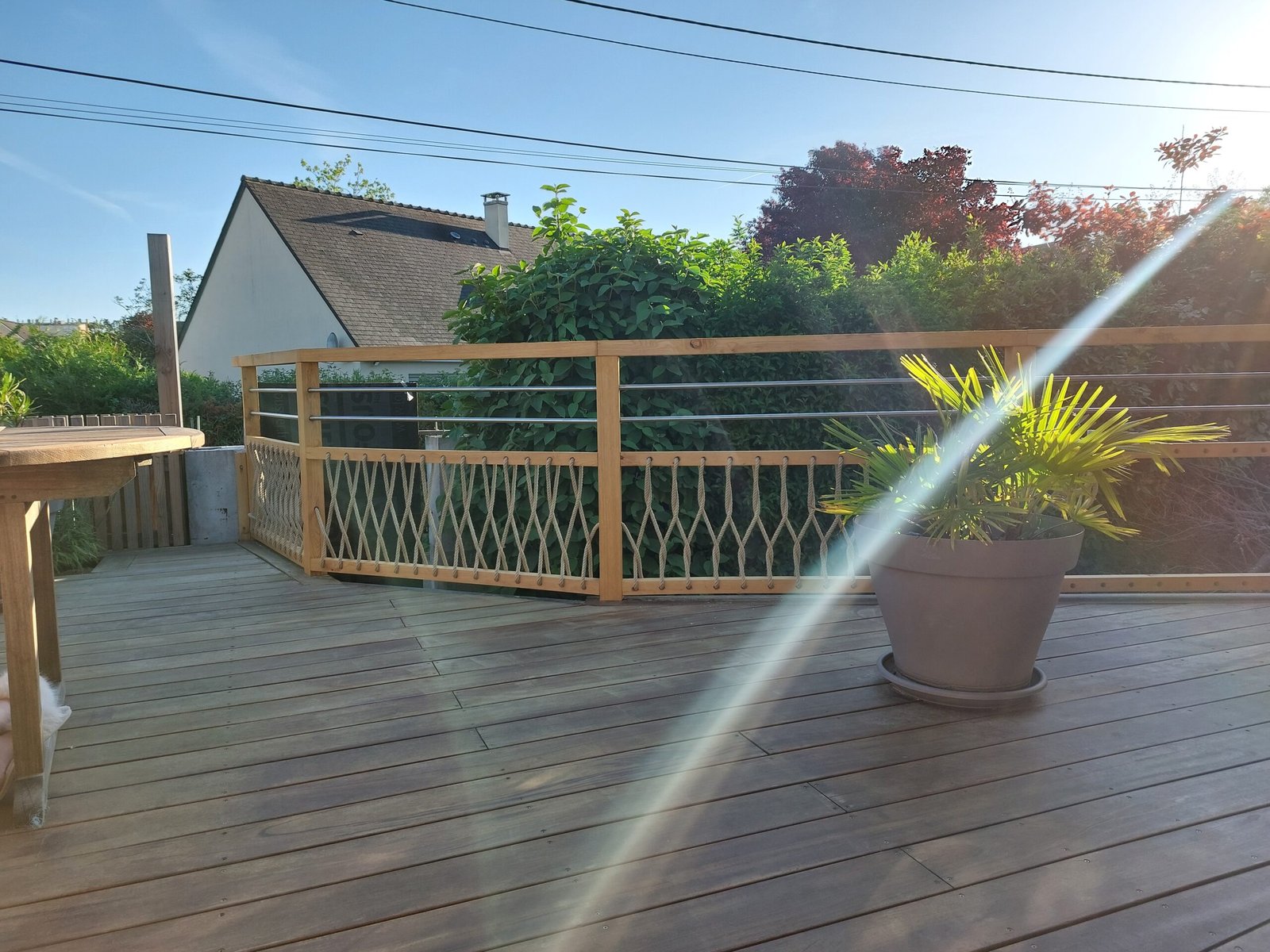 Création d’une terrasse sur pilotis, offrant un espace extérieur dégagé et surélevé. Pour garantir intimité et sécurité : installation d’un brise-vue en bois sur mesure et d’un garde-corps au design moderne, associant bois et cordage. Le tout crée un environnement bohème, harmonieux et soigné.
